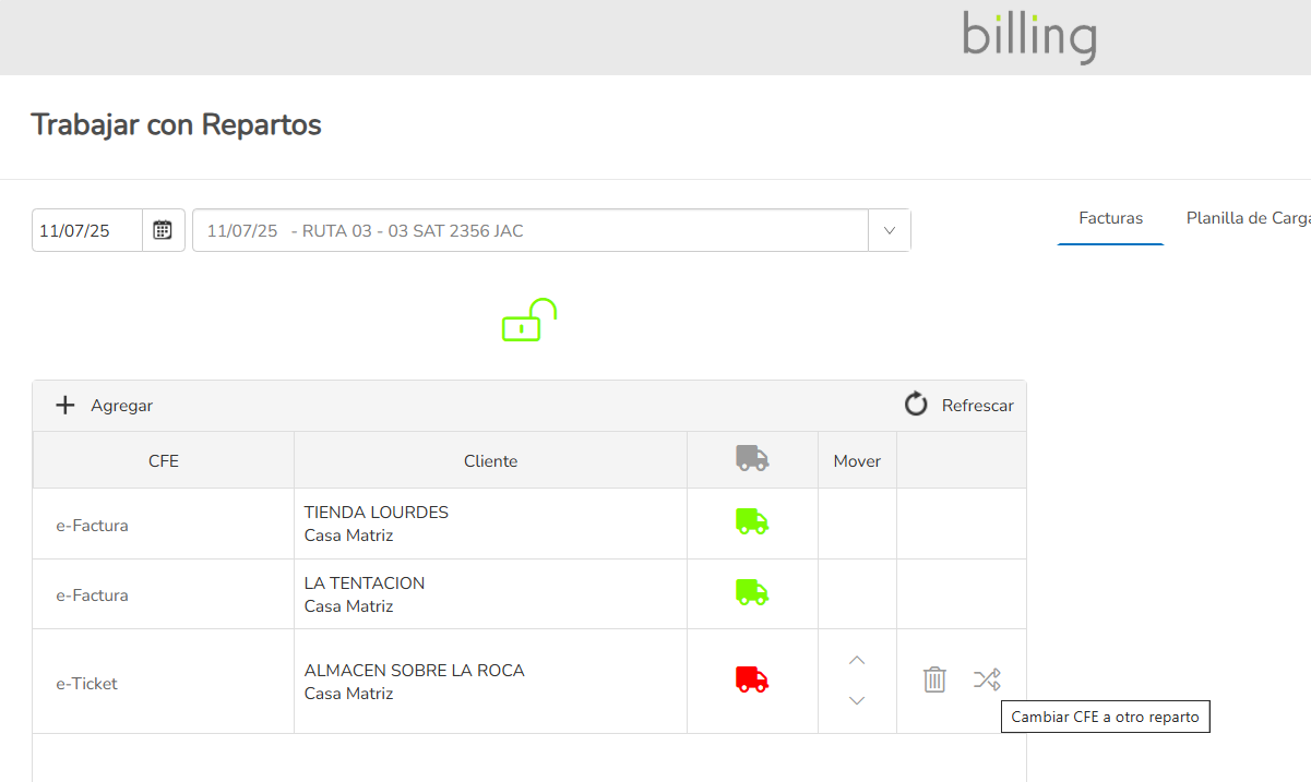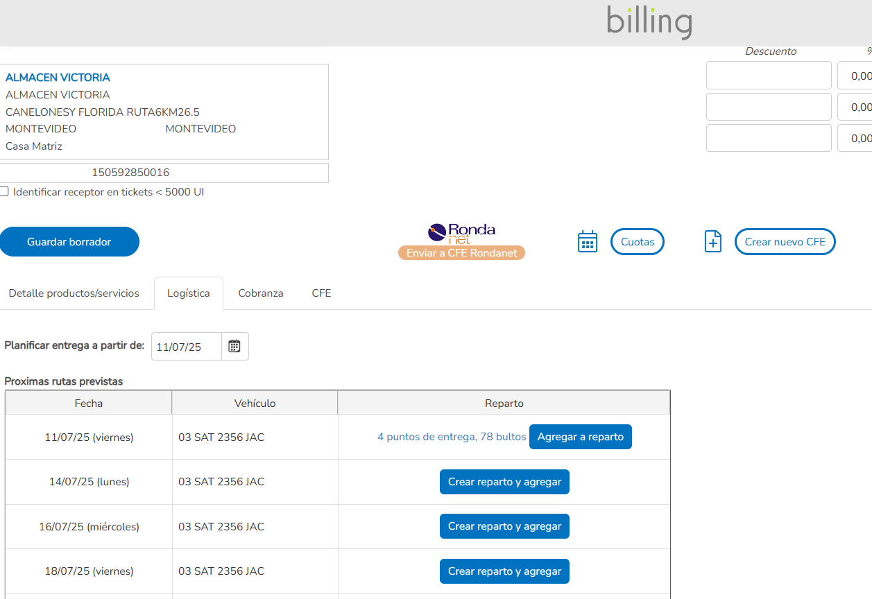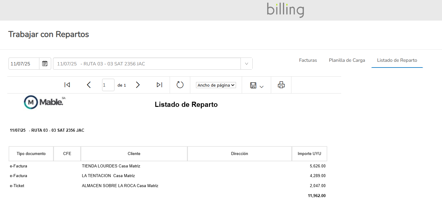 Gestión de rutas. Asignación dinámica de facturas a repartos. Planillas de carga y listados de reparto. Geolocalización de puntos de entrega.