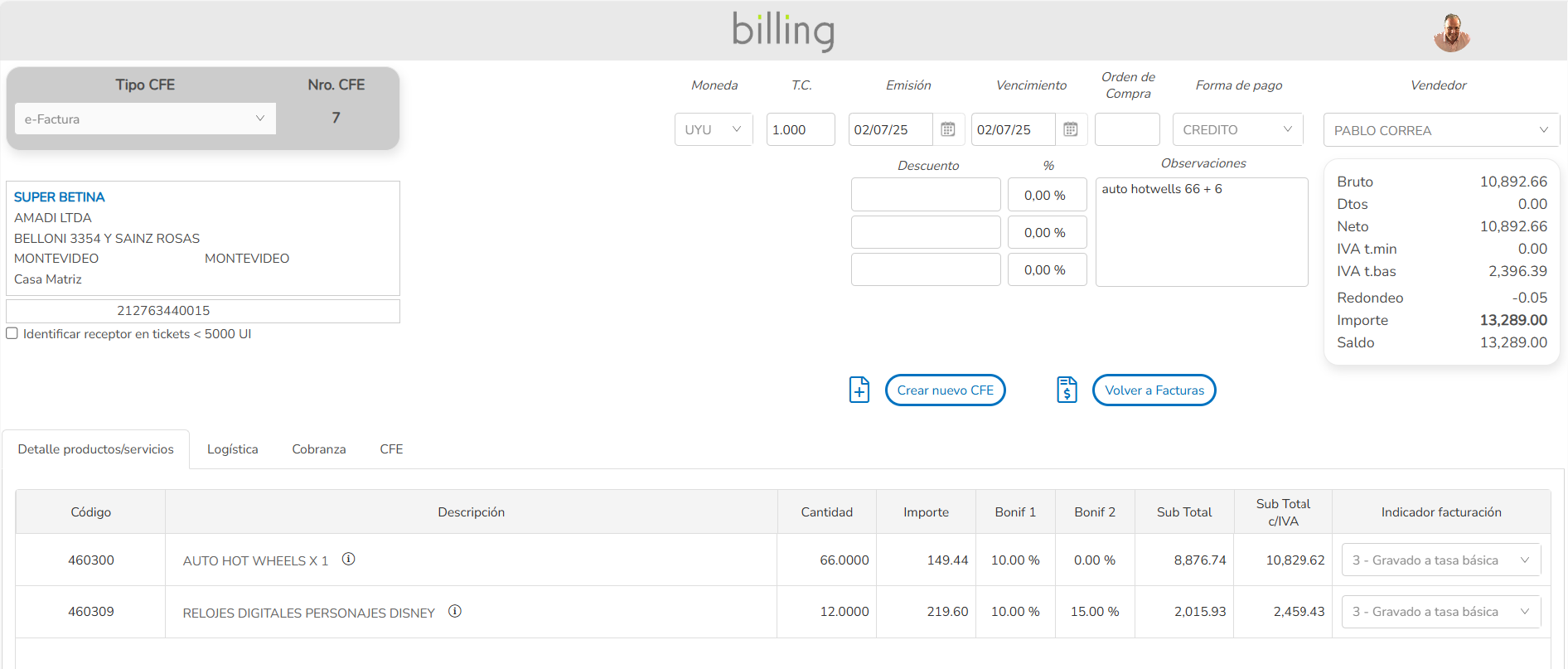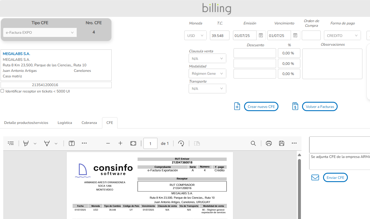 El sistema procesa sus CFEs a través de CFERondanet (GS1 Uruguay), líder en servicios de facturación electrónica en Uruguay.
