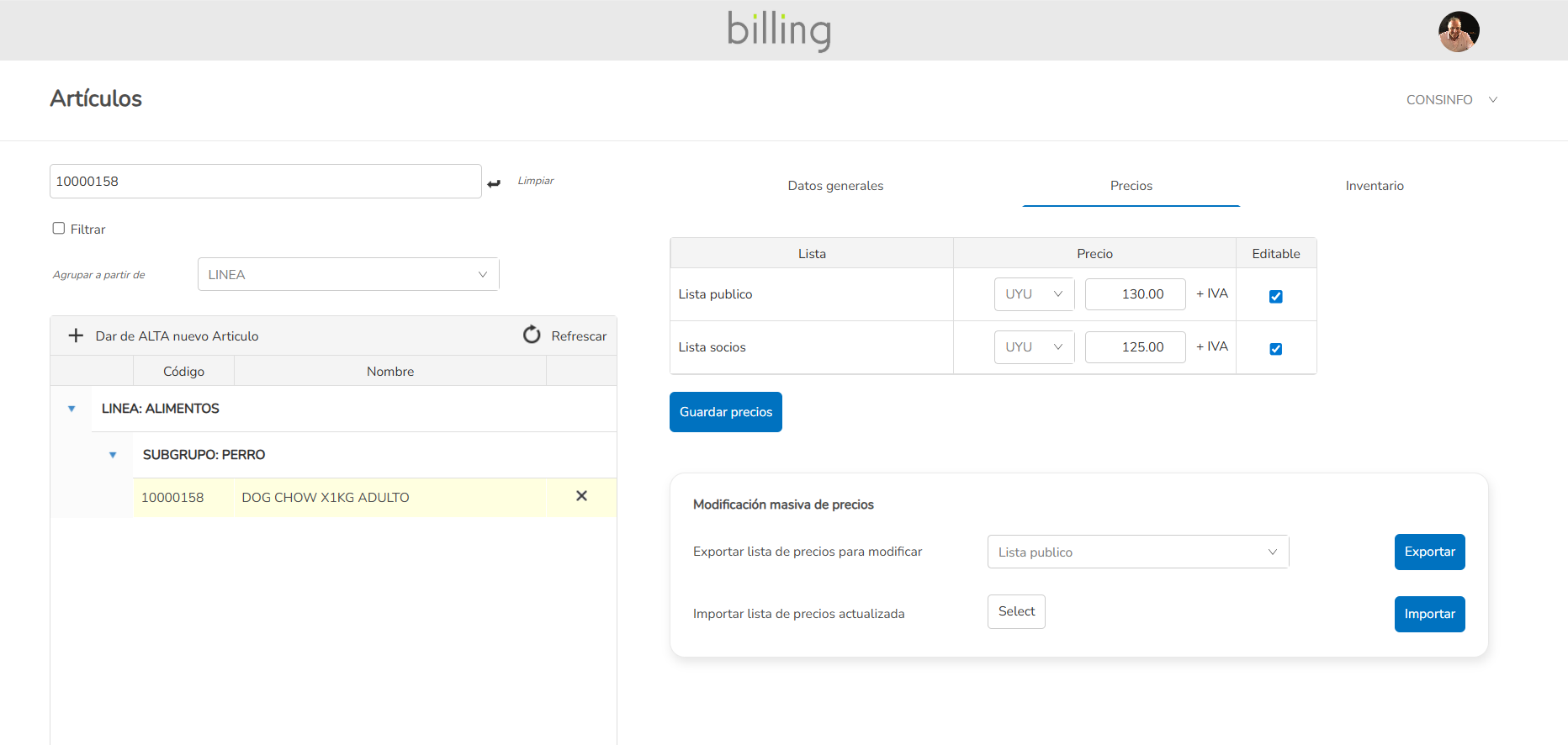 Catálogo organizado, variantes, agrupaciones, precios y estadísticas por producto.